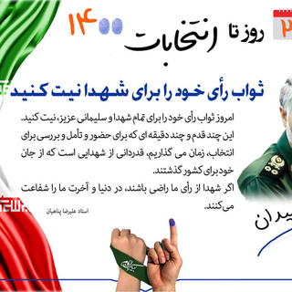 روز شمار انتخاباتمقام معظم رهبری : دربارهی انتخابات، امام بیانهای مهمّی دارند: انتخابات را فریضهی دینی میدانستند؛ تصریح کردند امام به تعبیر «فریضهی دینی» دربارهی انتخابات. در وصیّتنامهی امام یک عبارت بسیار هشداردهندهای هست که میفرمایند: «عدم حضور در انتخابات، در بعضی مقاطع چه بسا گناهی باشد در رأس گناهان کبیره»؛ یعنی دربارهی انتخابات نظر امام این است. یا در یک بیان دیگر میفرمایند: «کوتاهی در مشارکت -یعنی مشارکت در انتخابات- دارای پیامدهای دنیوی، چه بسا تا نسلها بعد و مستلزم بازخواست الهی است»